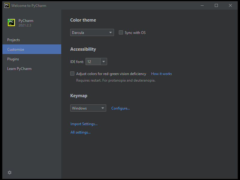При первом запуске PyCharm мы можем найти ссылку All settings… на вкладке Customize.